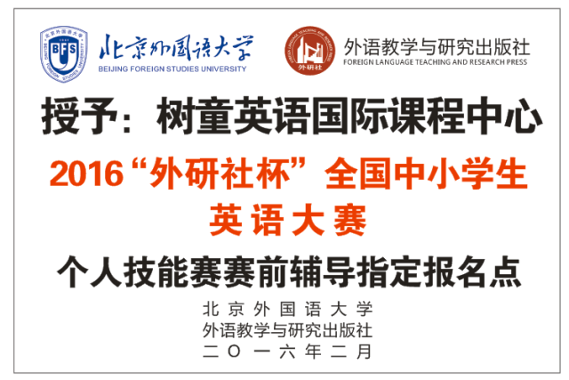 0为了推进素质教育,为国家培养具有创新能力、国际竞争力和跨文化交际能力的人才,全面实施教育部颁布的国家《英语课程标准》对英语课程提出的新要求,推进和践行社会主义核心价值观教育,北京外国语大学将于近期组织开展2016“外研社杯”全国中小学生英语大赛,本赛事分为“个人技能赛”和“团体挑战赛”。本赛事历史悠久,系“外研社杯”全国外语大赛的核心系列赛事之一。现就广州、东莞、惠州、信阳等地个人技能赛的报名组织工作安排如下:一、组织机构 主办单位:北京外国语大学 承办单位:外语教学与研究出版社 学术支持单位:全国基础外语教育研究培训中心、全国外语特色学校教育研究会、剑桥大学出版社、培生教育集团、华南师范大学中小学英语学科发展国际化共建平台PRT项目组 官方独家赛事测试平台:北外在线(北京)教育科技有限公司 官方独家网络赛事平台:网易有道词典 战略合作单位:北外国际教育集团、北京外研通教育科技有限责任公司、外研讯飞教育科技有限公司、传递教育、掌上新标准、TBI 国际教育集团 支持单位:英国大使馆文化秘书处、启行营地教育发展中心 公益支持:中国宋庆龄基金会外研文化教育基金、北京启行青年发展基金会 大赛官方指定用车:北京燕宝汽车服务公司 二、比赛名称