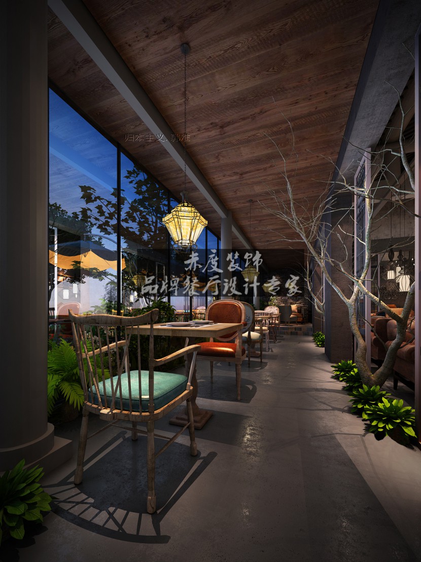 赤度装饰设计-主题餐厅装修面馆效果图 走进餐厅的另一侧,你会发现另一种美。绿草与原木桌椅相结合,落地窗外是一方天空。不管外面的世界如何喧嚣吵闹,在餐厅中你享受的都是一种放松,安静。浅棕色的原木天花,那是自然给予的美感。 每一个座位上,都有一盏温暖别致的吊灯照耀着,安静的听着每个人的故事。