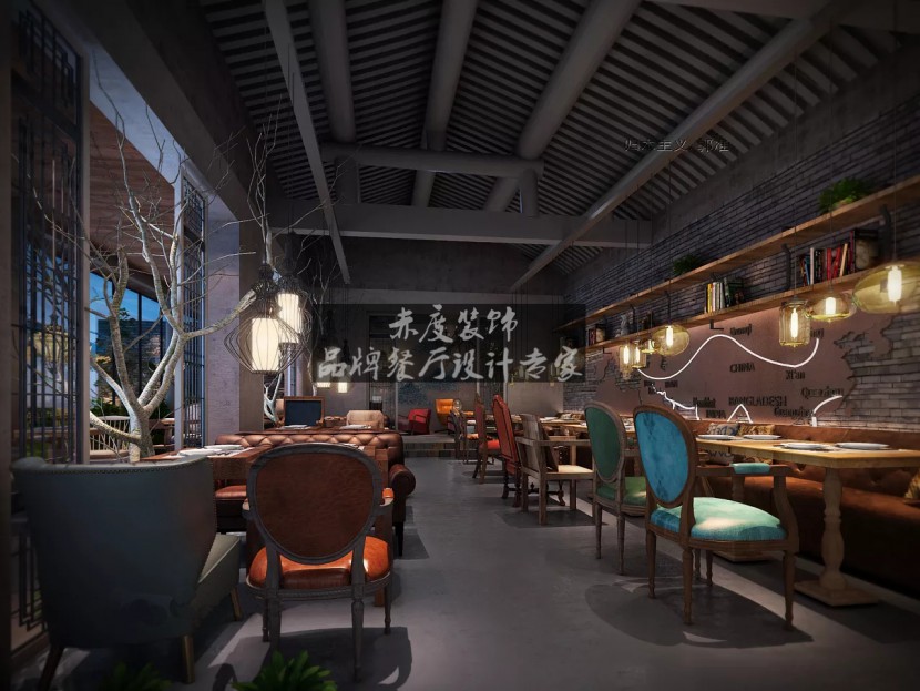 赤度装饰设计-主题餐厅装修面馆效果图 本案例中,我们可以看到设计师在色调上采取了暗色系,灰色的地面与天花相呼应,打造了一个拥有神秘感的氛围。充满自然气息的树干,原木桌椅在柔和的灯光下越发显得宁静祥和。当我们走进餐厅中,你会发现整个主题餐厅装修的风格带给你是的心灵的平静。 别致的吊灯,黑色的混凝土墙面以及墙上的小饰品,无不一一述说这设计师的巧妙用心,更显示出设计师“回归自然”的设计理念。