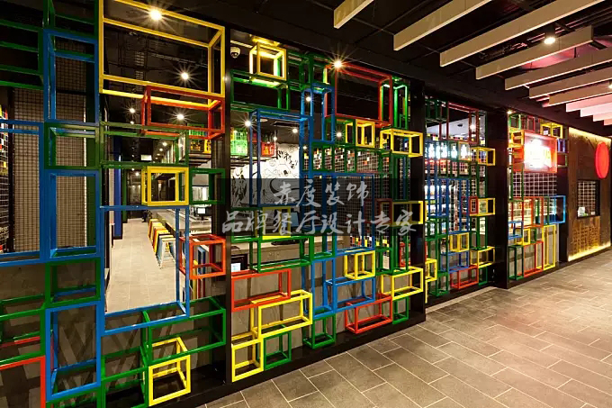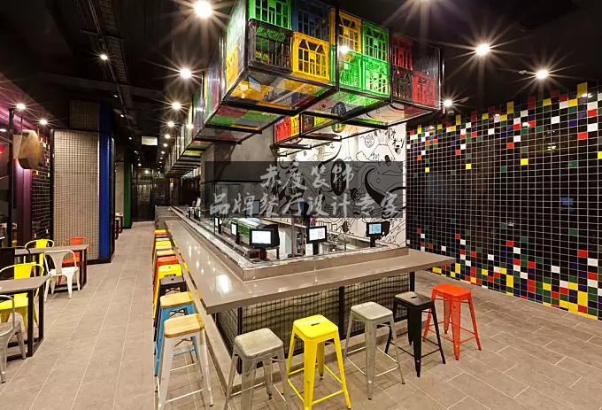 吧台上方压低的吊顶由不同色彩的正方体组合而成,明亮的灯光和个性的装饰品使得整个环境多了几分俏皮的味道。墙面采用了黑色以及方块,是不是让你们想起了方块这款游戏呢?