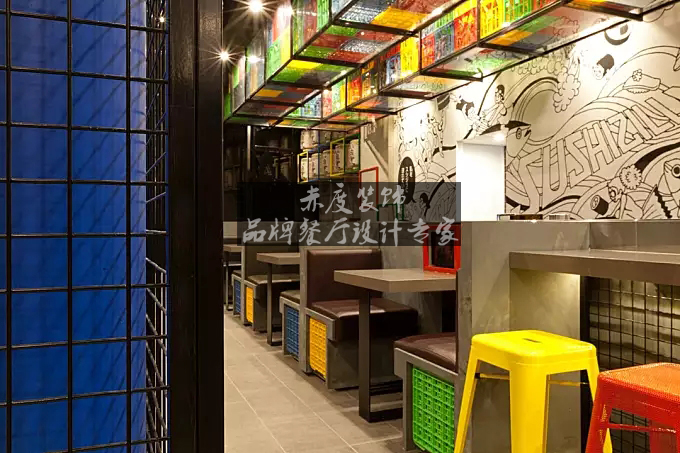 设计师在卡座区域上,也采取了不同色彩的正方体组合,墙面则是漫画涂鸦,俏皮中多了一些玩味。色彩的运用,别具一格的墙面设计都给餐厅带来了明亮感。空间设计自成一套风格。环境与氛围结合统一。