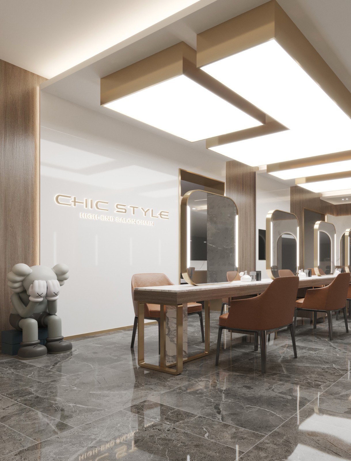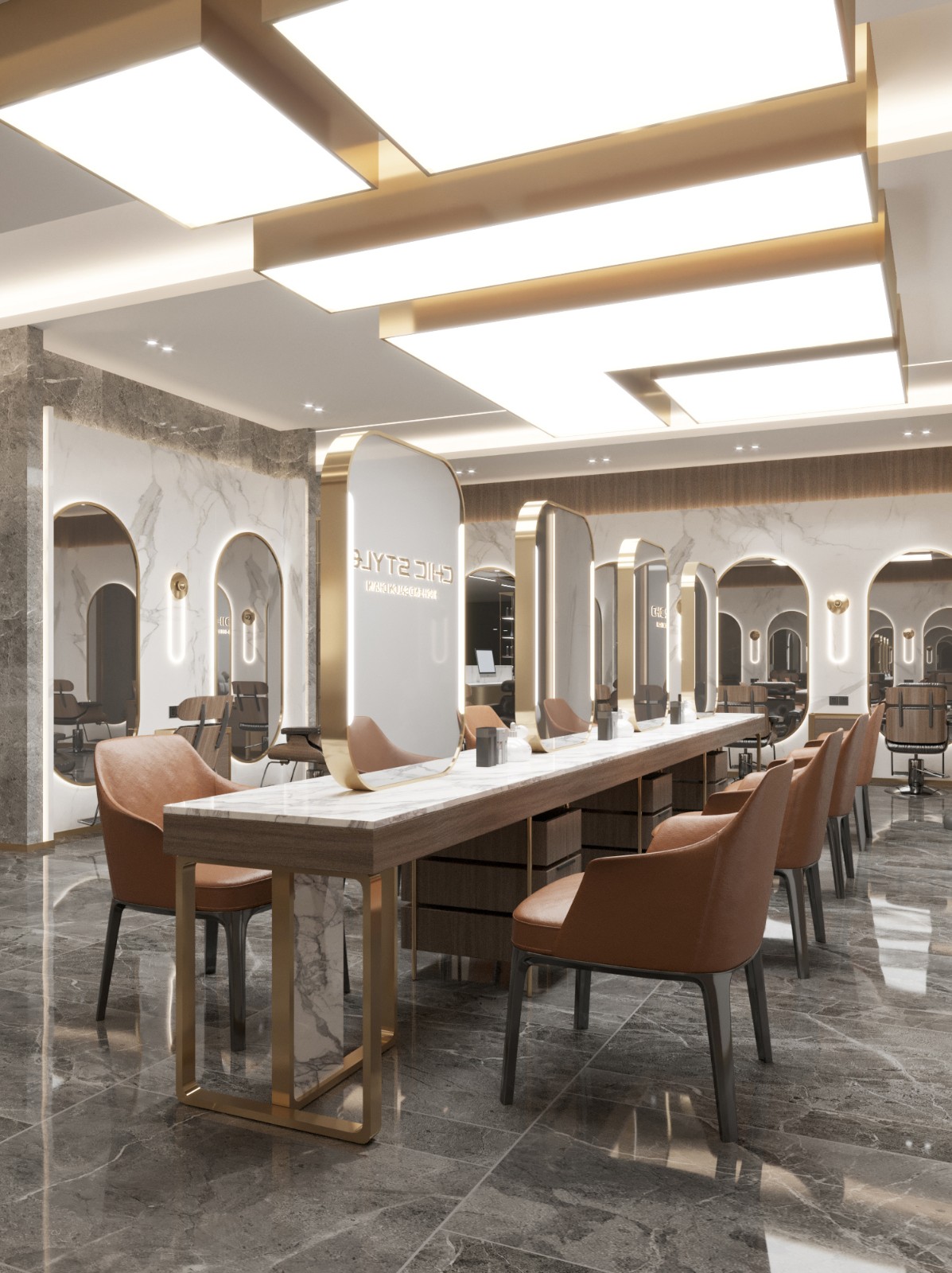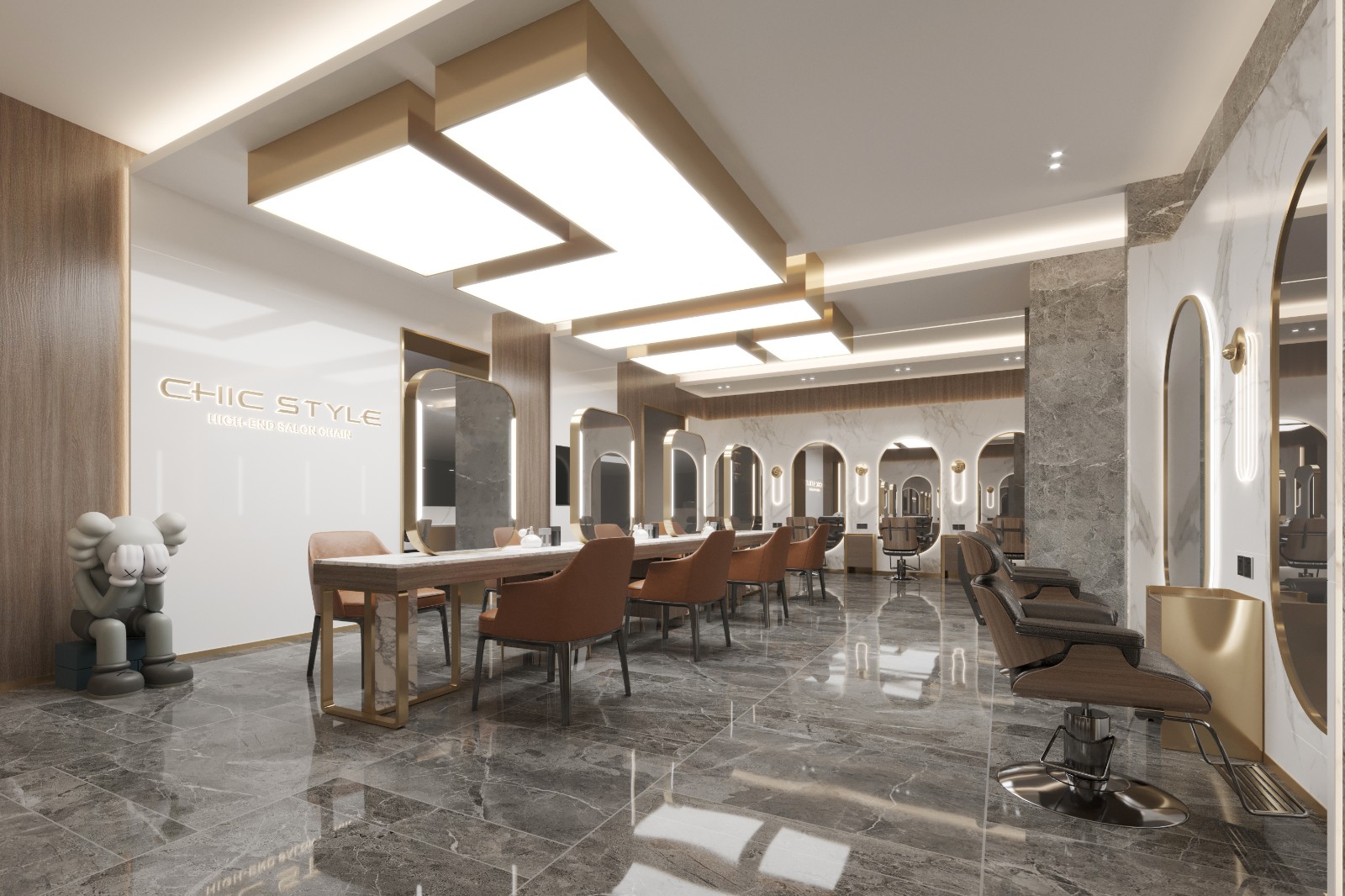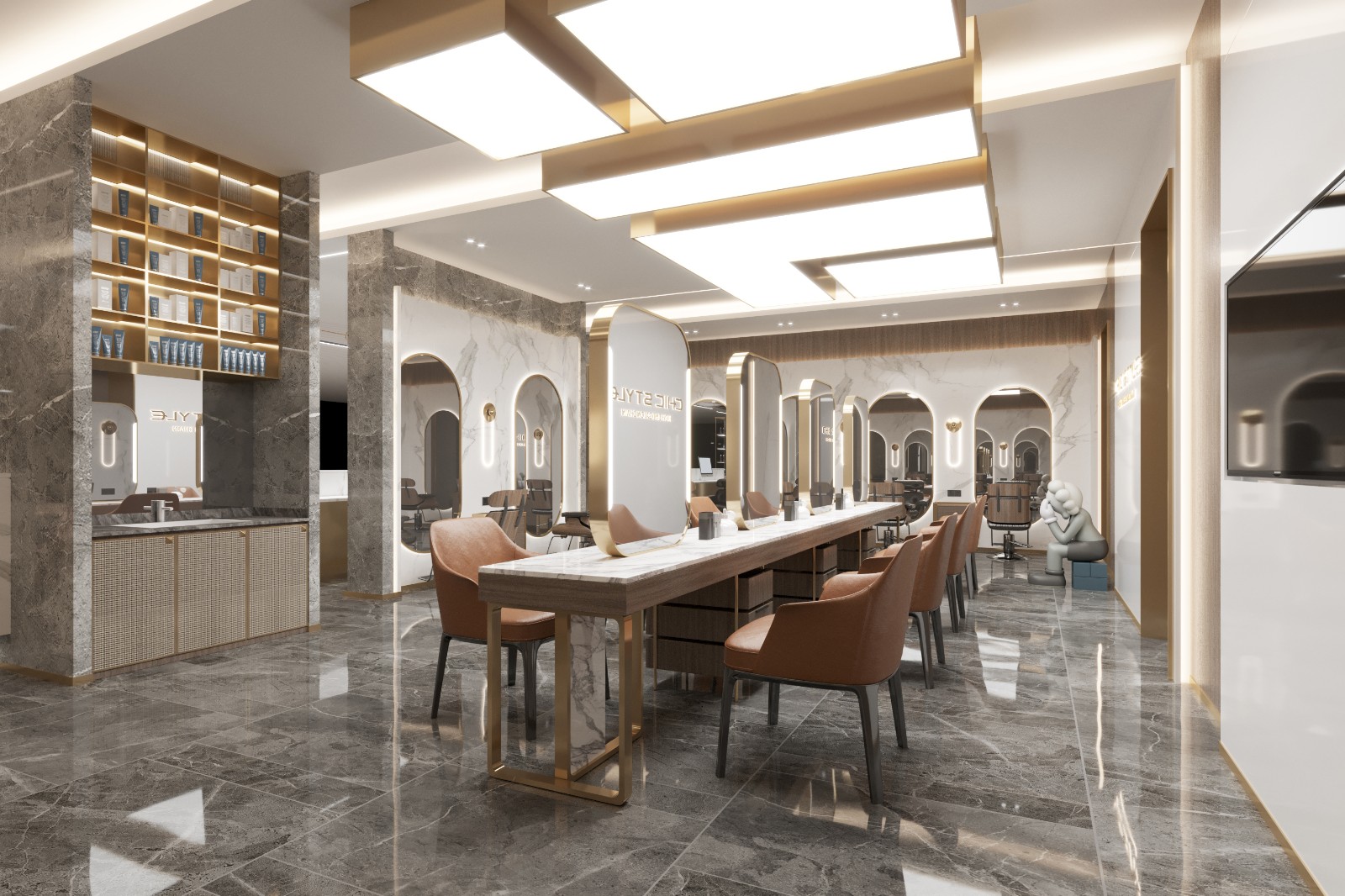 设计公司 | Design Company : Pro.S布舍设计 设计总监 | Design Director : 黄梓铖 Henry Wong 主案设计 | Master case design : 金涛 参与设计 | Involved in the design : 金涛 谢辉 项目类型 | Project Type : 美发沙龙 项目地址 | Project address: 中国 广州 项目面积 | Project Area : 160㎡ 主要材质 | Main Material : 木饰面、大理石、拉丝黄铜不锈钢、亮面烤漆板、夹丝玻璃 联系电话 | 13560440388 ![]() ![]() ![]() 钦慕之至,点石成金。 如今,共享经济变得越来越规范化, 并且衍生出了各种不同的工作方式, 拥有自己的店面也不再是必然的需求。 ![]() ![]() 对于以自由身份工作的造型师来说, 这种工作方式能够带来许多好处。 门头设计采用大面积玻璃, 将Chi style衍生而来的线条造型贯穿全案, 全尺度的落地玻璃门窗, 打破了空间中的距离感, 无意间拉近了某种互动感, 也为整体视觉感受注入了几丝轻盈透亮的气息。 ![]() ![]() ![]() ![]() 弧形大理石背景墙成为焦点, 像河流般流淌于天际。 独特的造型通过参数化设计实现, 模拟出圆滑的抽象形态。 ​