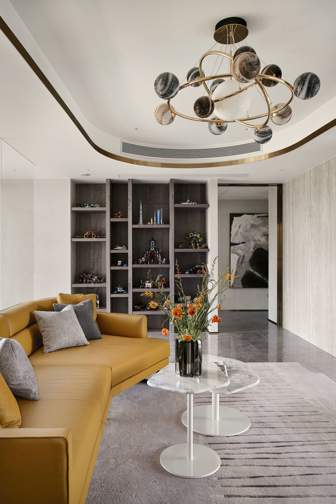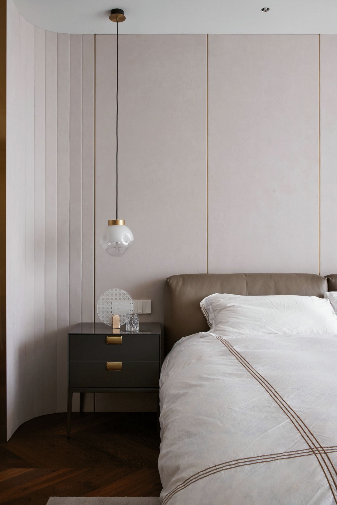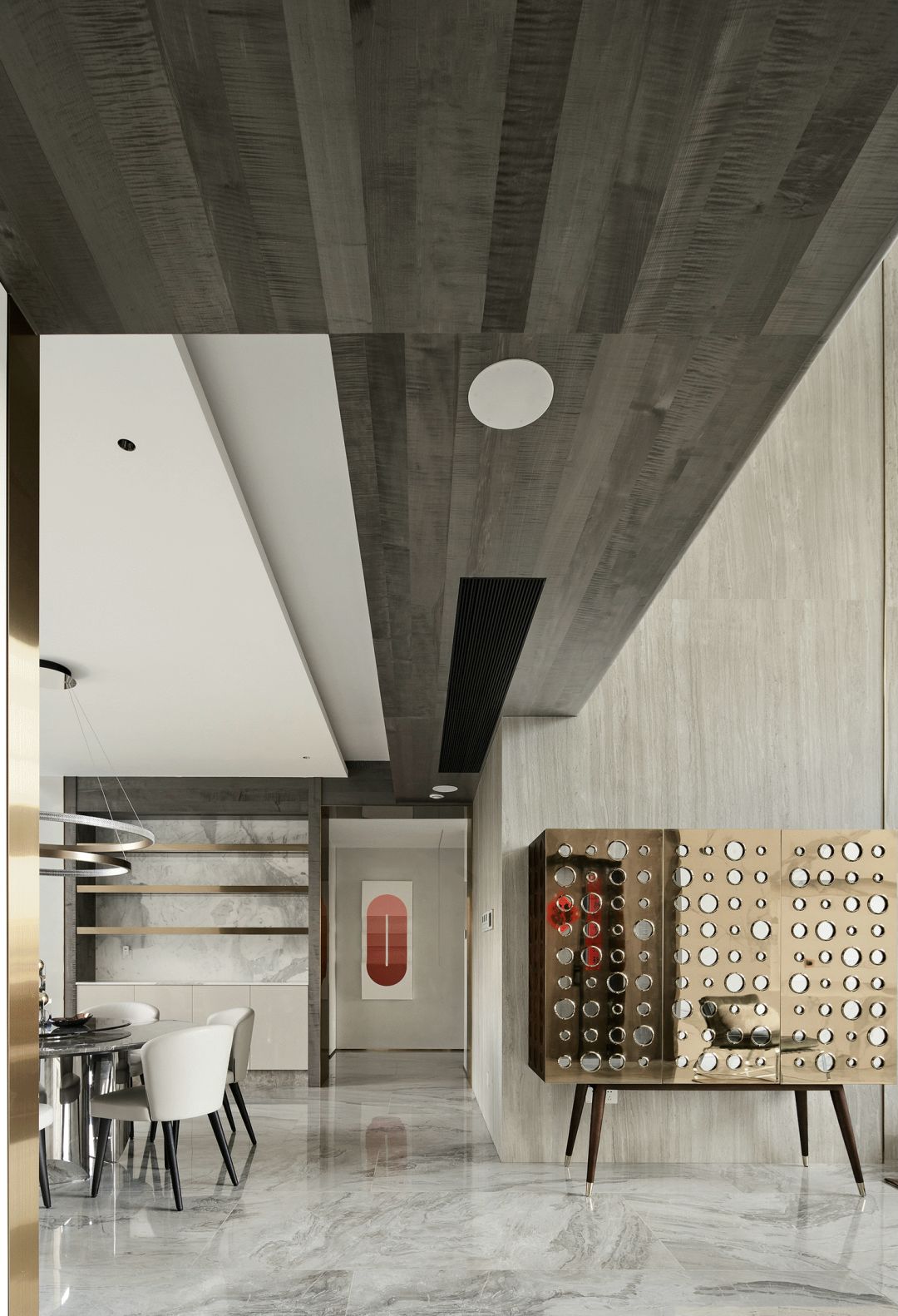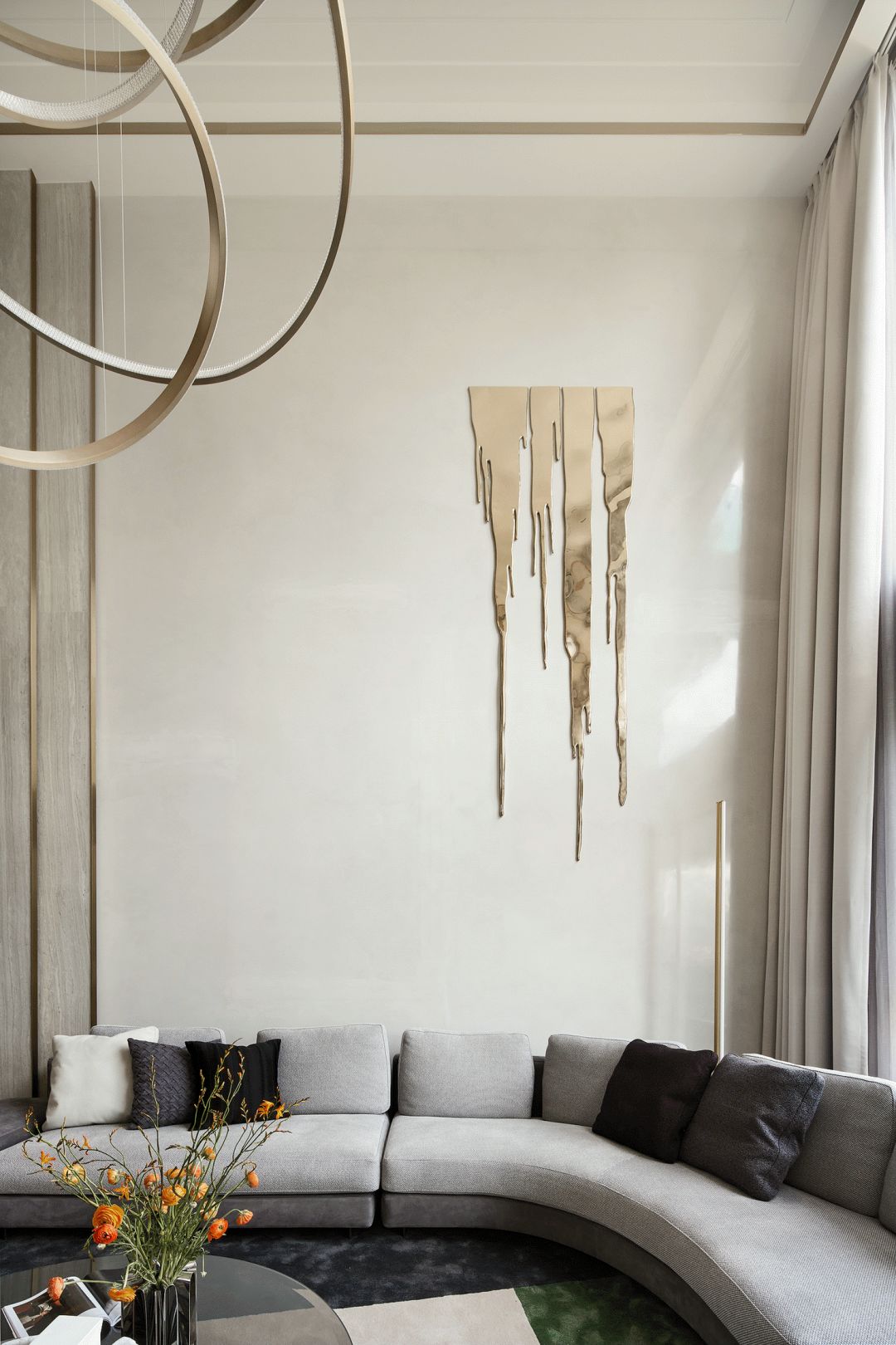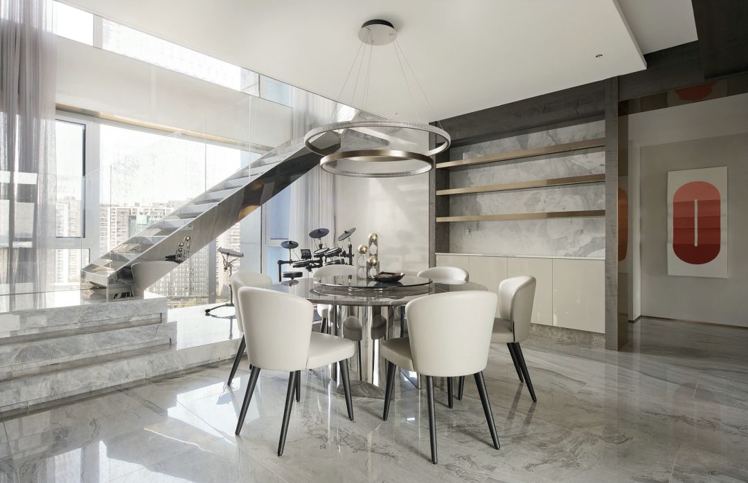 每一个全案,都是私人订制 Customized for each project. 项目地址 / 浙江 · 杭州 Location / Hangzhou · Zhejiang 项目类别 / 全案委托 Project Types /Total Solution 毕业时间 / 2021 . 04 Finish Time / April. 2021 设计团队 / 力设计 Design Team / Li Design 摄影 / 林峰 Photographer / Lin Feng 户型图 Plan 一楼平面布置图 二楼平面布置图 关于设计:注重空间的高品质与设计感,将优雅高贵的质感结合灰色木饰面及金色艺术装饰,巧妙的呈现出奢华格调与简洁大方的视觉享受,同时带来了繁复含蓄的感官体验。 客厅 Living room 效果图 实景 客厅背景的金色艺术装饰宛如大自然水滴聚集落下那一瞬间形成的美妙天然状态,与这套位于钱塘江畔数百米外的一线江边景色相互呼应; 餐厅 Dining room 效果图 实景 玄关进门映入眼帘的就是这个金光璀璨的餐边柜,搭配上走廊尽头的跳色装饰画,赋予餐厅活跃气氛;黑色大理石餐桌搭配白色皮料餐椅,经典但又高级的搭配,加上华丽吊灯的渲染,营造出餐厅温馨奢华的用餐氛围。 一楼主卧室 Bedroom 主卧作为和客厅一样拥有同样视野、同样尺度的观景台,每块岩板与奢石都经过设计师严格甄选,充分利用材质的天然纹理,与各种进口软装的搭配融合,整体氛围简洁、流畅、奢华。 二楼起居室 Living room 它摒弃了过度华丽的硬装,加入了更多温润细腻的木质元素,也加入了更多金属提高质感,但更多的是与色彩的交流,与色彩的碰撞,有与色彩的相得益彰。 二楼主卧室 Bedroom 大面积白色纹理的瓷砖交错铺贴,充满整个卫生间墙面地面,给人简洁大气的视觉体验,在角落中,搭配上乱中有序的装饰画和颜色鲜艳的花束使整个空间既干净又有焕然一新的感觉。 二楼儿童房 Bedroom 象征着青春与生命的绿色被设计师很完美的运用到极致,它浓郁但又不失生机,在软装里虽然是小众一族,但却是浓墨重彩的一抹特色。 二楼次卧 Bedroom 有立体肌理的白色墙纸搭配不规则床头柜使得整个次卧充满活力。 有感: 最好的空间是这样的:我们居住其中,却感觉不到自然在哪里终了,艺术在哪里开始。 ——林语堂 |